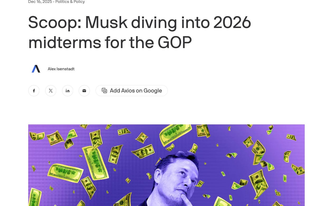Why it matters: Musk — who threatened to launch a third party and support challengers to Republican incumbents during his dispute with Trump — is now firmly back in the GOP’s camp.The tech billionaire recently cut big checks to help Republicans win congressional races next year and indicated he’d give more throughout the 2026 cycle, two sources with knowledge of the situation tell Axios.