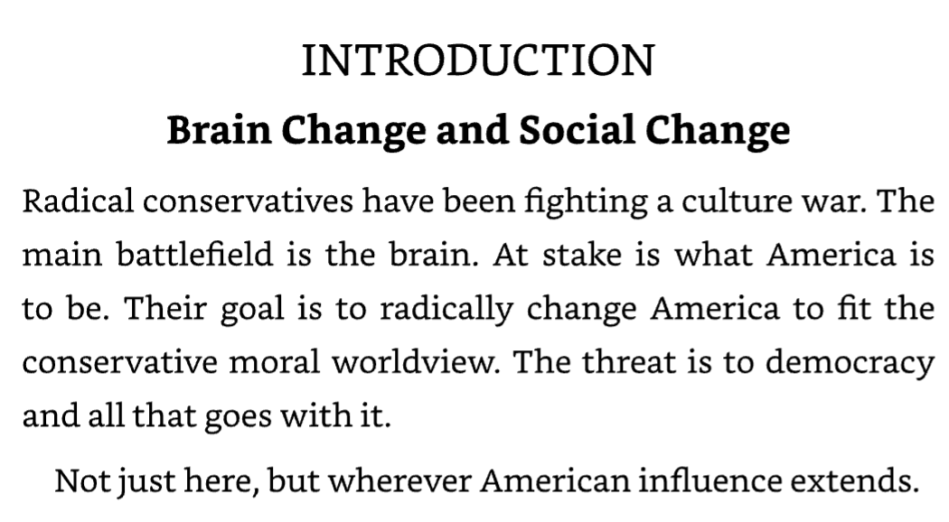 Lakoff saw this coming from decades away. His 2008 book The Political Mind, which the FrameLab Book Club is currently reading, opens with this warning: