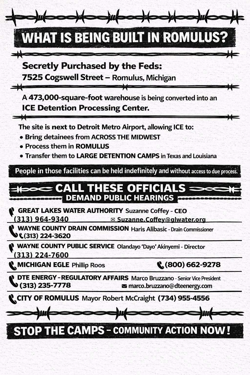 The Romulus City Council voted unanimously against the facility. The mayor said he will not issue a certificate of occupancy while he holds the office. The Michigan Attorney General told ICE to halt. Thirty-three organizations moved in the same week so that no single agency could act in isolation and claim it didn’t know. Not one of those agencies was consulted when the building was bought. Now they are demanding their founding right to redress their grievances.